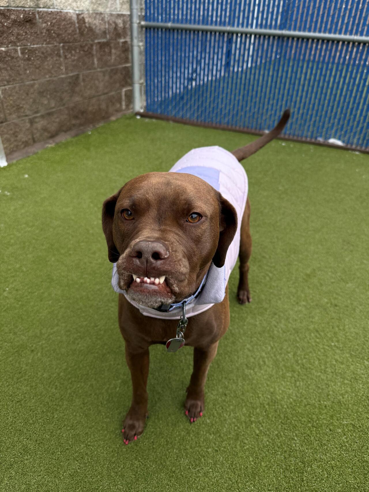 LucyLucy is a deaf pit mix that has been coming to Camp since 2019. She likes to spend her time running around the ramp and trying to play with the littles. When she’s not bobbling around the play yard, you can find her signing up for our Enrichment activities. We are so thankful for you, Lucy!