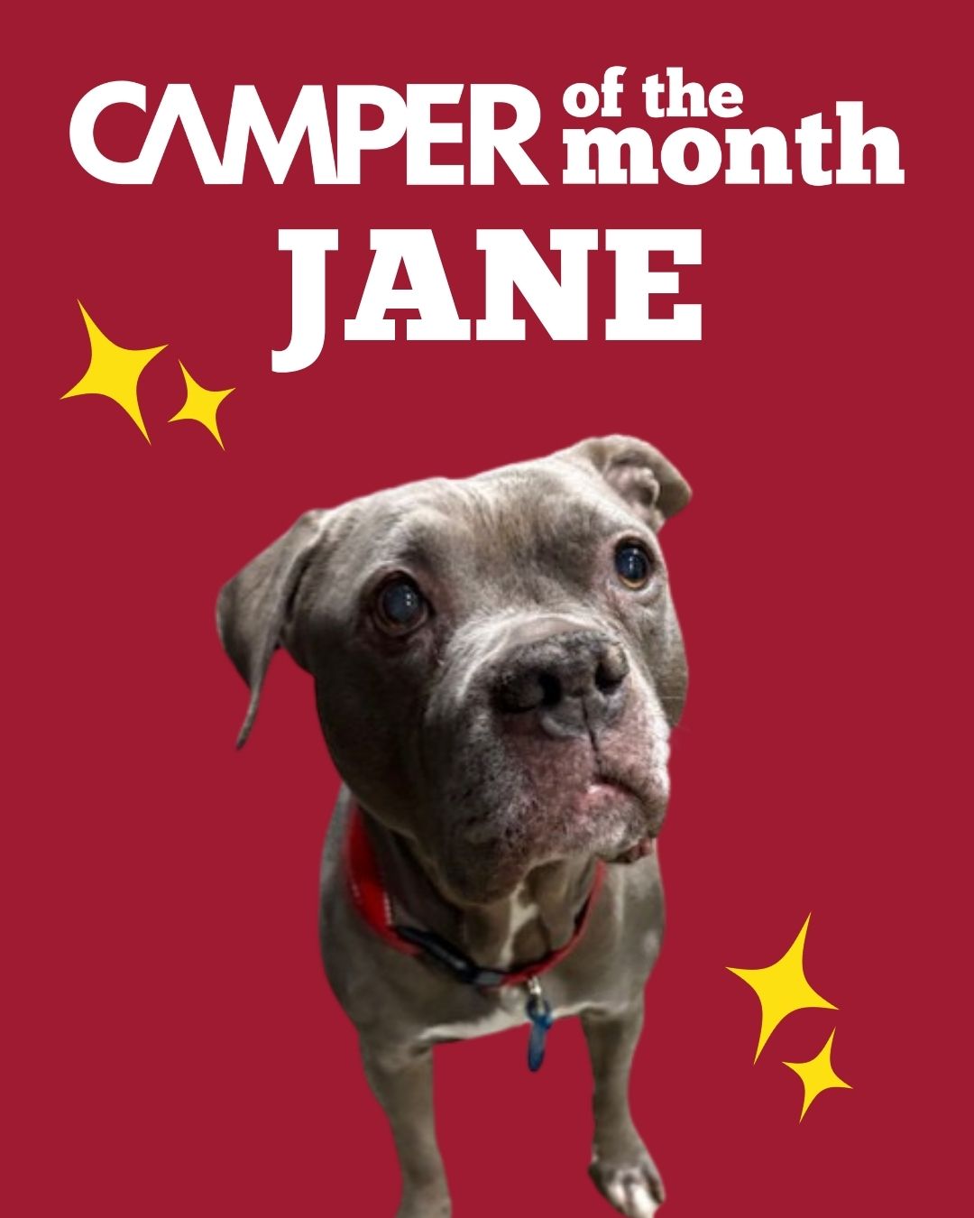 JaneCongratulations to Jane for being named our Camper of the Month for April! Jane is an 8-year-old Pitbull Terrier who is also a Rescue Ridge Alumni! She has been coming to Camp for the past 5 years. According to her paw-rents, Jane enjoys lying on the couch and going for walks in the park. Her favorite treat is peanut butter, and she loves her Kong. She is not a fan of baths or nail trimmings-- not every girl has to enjoy a spa day! Congratulations to Jane!