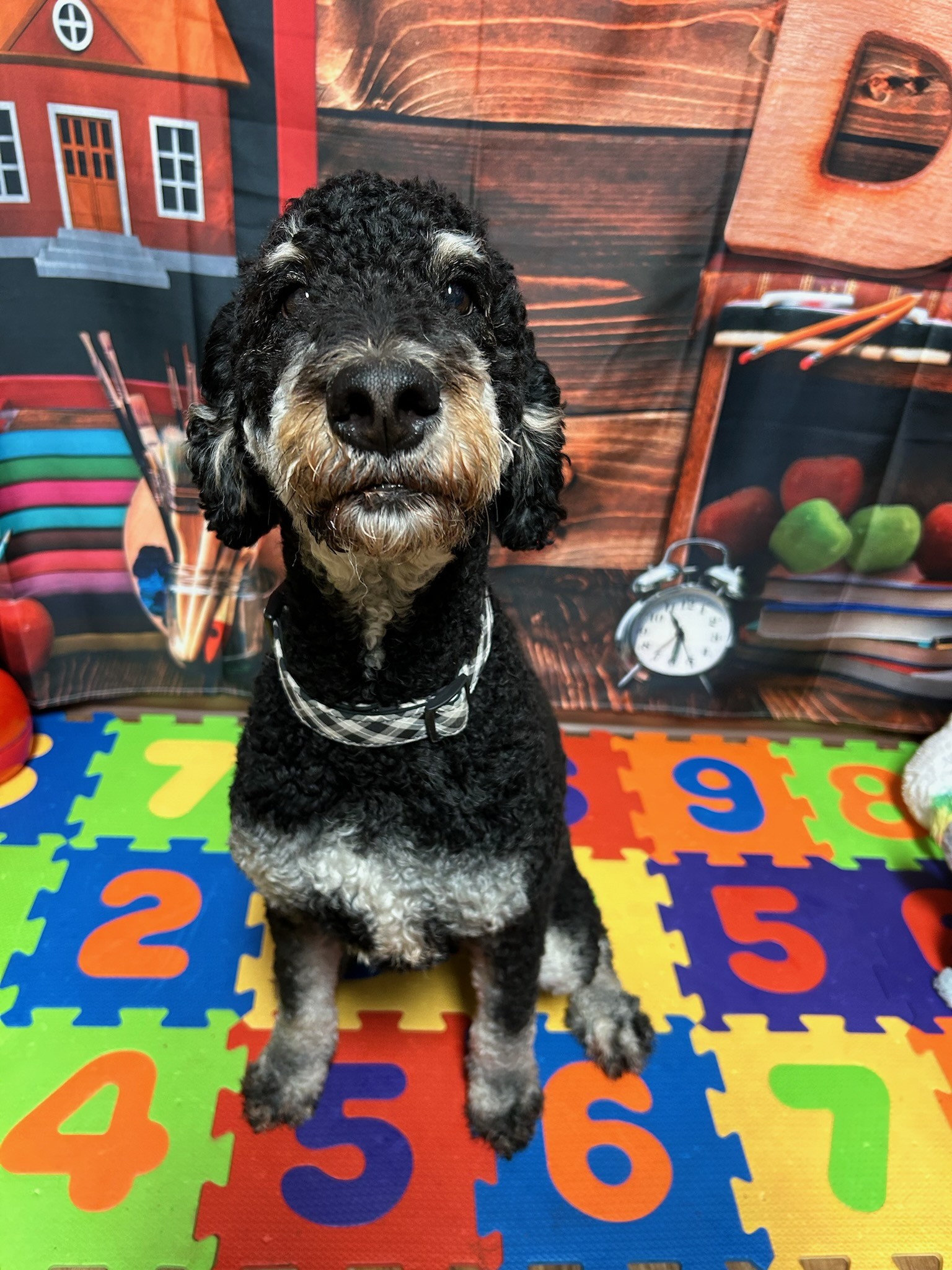 Charlie CMeet Charlie! Charlie is a 7-year-old Schnoodle mix who has been attending Camp since January of 2015! Charlie enjoys coming in for Daycare and and on occasion, boarding. He is a really good boy for his spa days as well and does not mind scrub a dub dubbing in the bathtub! Charlie has been known to "make-out" with the Counselors, he is a BIG lover! We all enjoy having him with us and love snuggling next to him on the play structure during his visits! Congratulations Charlie! Thank you, Gayle, for sharing your amazing boy with us!