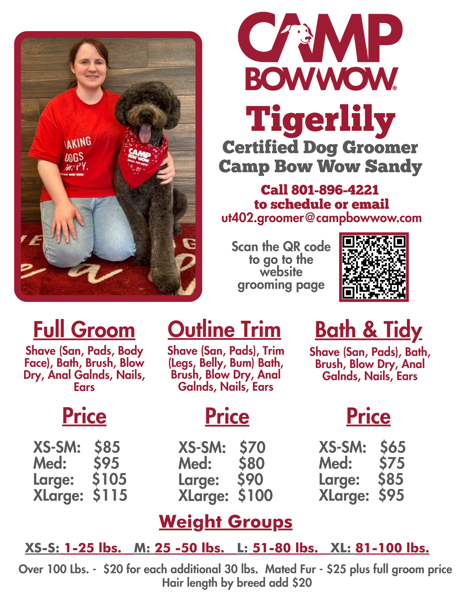 Our grooming prices and packages vary by location. Contact your local Camp for details.